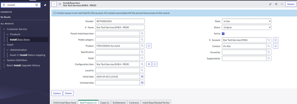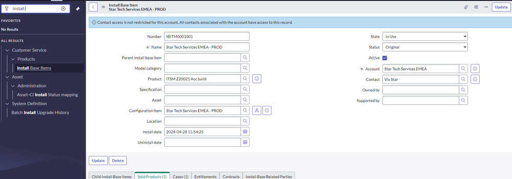 Now we’ve created the sold product, which is linked to the service offering and product model. We need to put together an install-based item. According to the ServiceNow documentation, an install base item represents a product instance that has been configured for a customer. Therefore, each application service requires a separate install base item for the PROD and non-PROD instances.